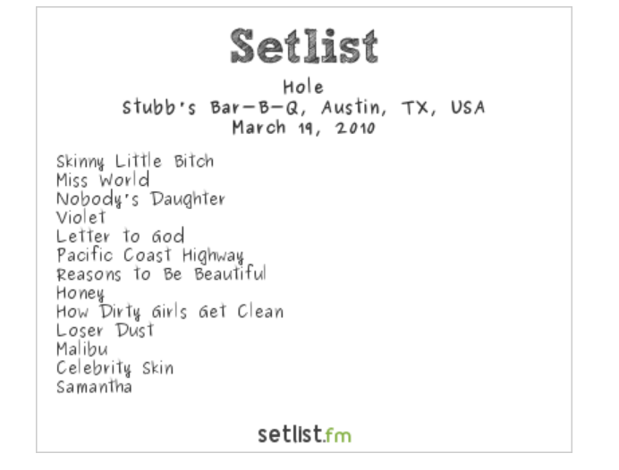 During SXSW in 2010 it was a completely rejiggered Hole that appeared at Stubbs as Courtney Love released her first new material in over a decade with Nobody’s Daughter, featuring the hot single, "Skinny Little Bitch."