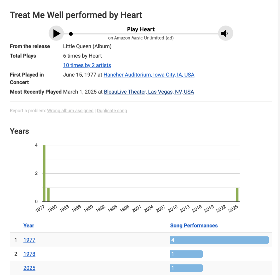 In 1978, the last time Heart performed "Treat Me Well" in concert (until this month), the charts were dominated by the Saturday Night Fever soundtrack, Andy Gibb, Chic, and Donna Summer.