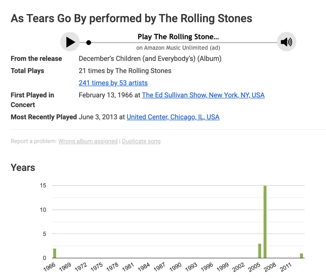 That's what the Stones did with "As Tears Go By," one of the early Jagger/Richards compositions they played a few times in 1966 and didn't return to until 2005's A Bigger Bang Tour - and even then they only put it on 18 of the tour's 145 setlists.