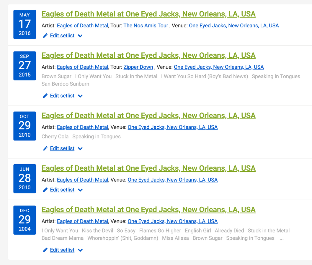 Bree Wilde: All right, let's go ahead and move on to Eagles of Death Metal, New Orleans. We looked it up, One Eyed Jacks.