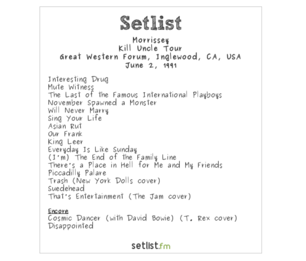 As adoring fans jump on stage to embrace Morrissey during the encore of his LA show on the Kill Uncle Tour, little do they notice David Bowie creeping towards the spotlight from behind the drum riser.
