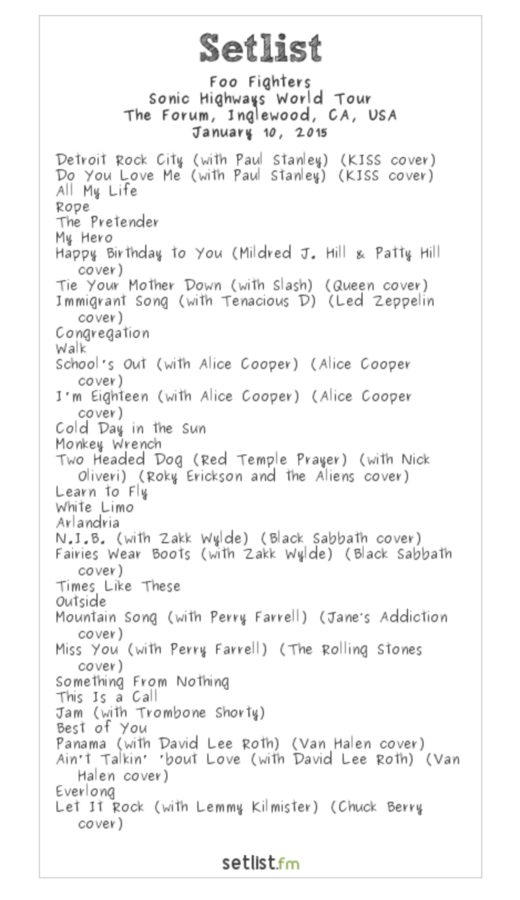 The cover-heavy 3.5 hour show had guest appearances by Paul Stanley of Kiss, Slash, Alice Cooper, Perry Farrell, Zakk Wylde, David Lee Roth and Lemmy.
