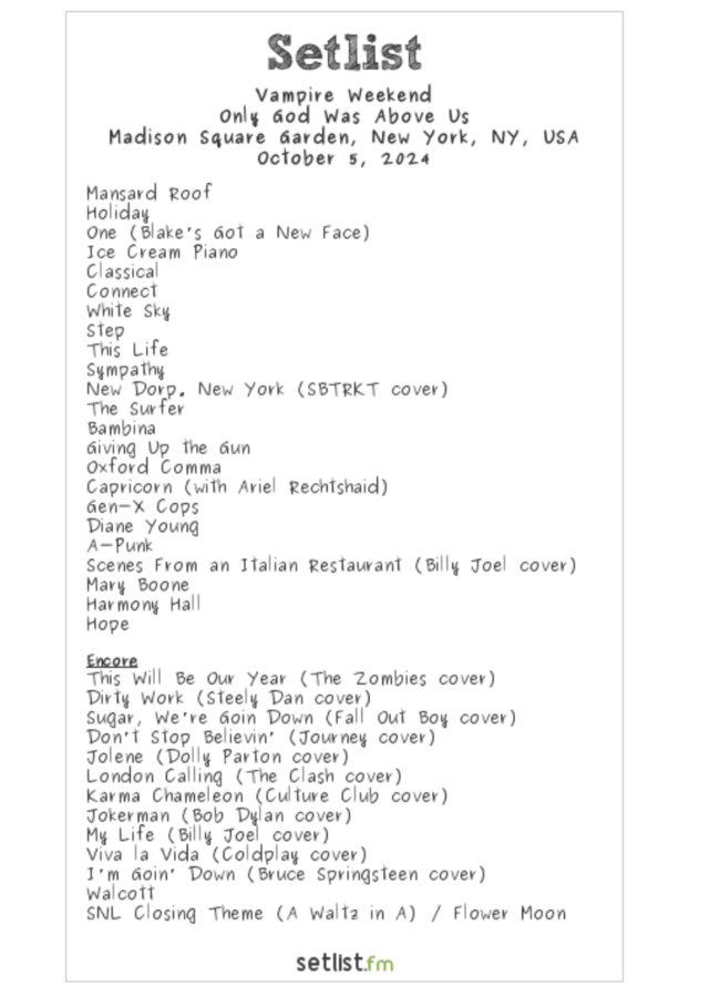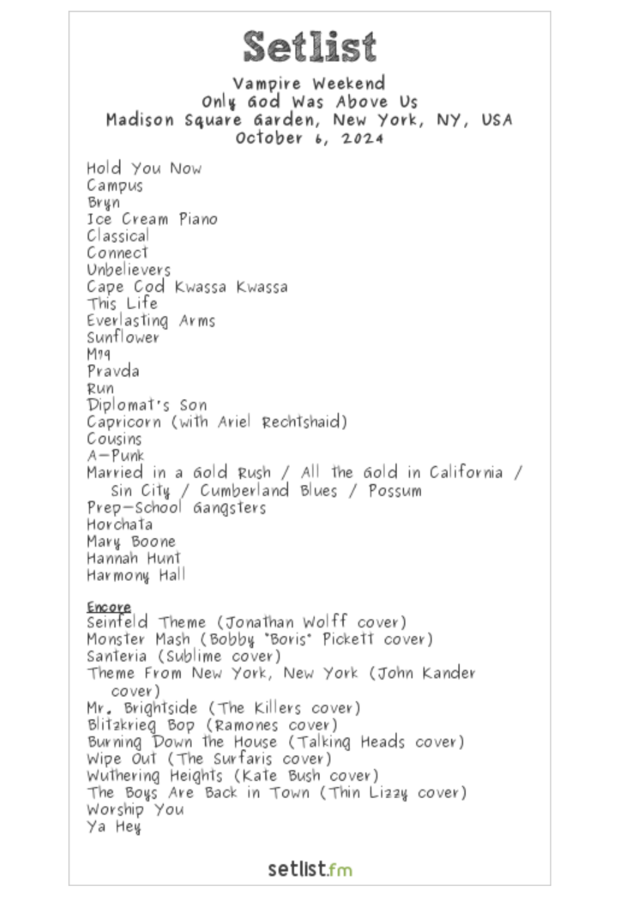 On Saturday, October 5 , the trio fronted by Ezra Koenig, gave the crowd selects from Fall Out Boy, Steely Dan, Culture Club, and The Clash as well as others. Then yesterday, October 6, the two-time Grammy winners did the theme from Seinfeld, "New York, New York," and a Ramones singalong, among many more.