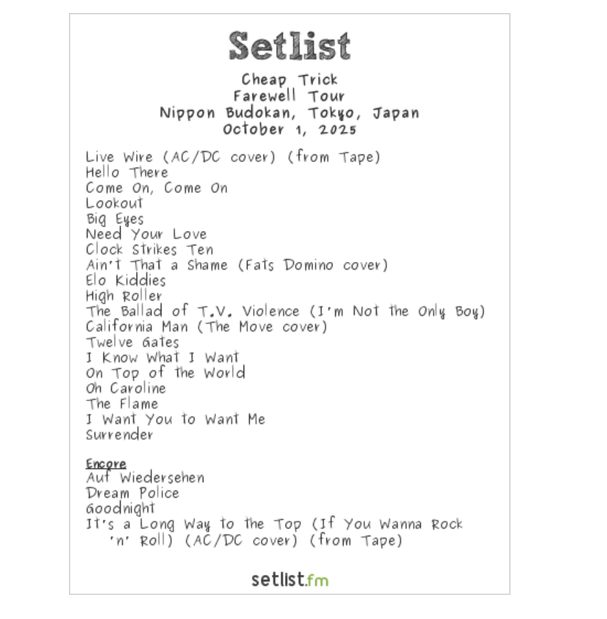 Cheap Trick said hello and goodbye at once Wednesday (10/1) when they returned to the Nippon Budokan in Tokyo, the same arena that put them on the rock 'n' roll map nearly half a century ago.
