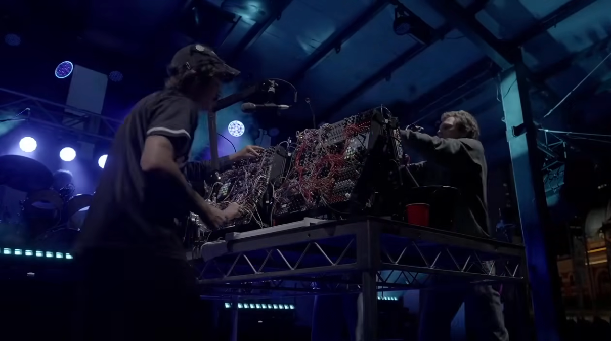 The centerpiece of the show's stage setup was “Nathan,” the modular synth and sequencer table. Five of the six members make music and sound around it, pushing faders and turning knobs while building loops in real time.