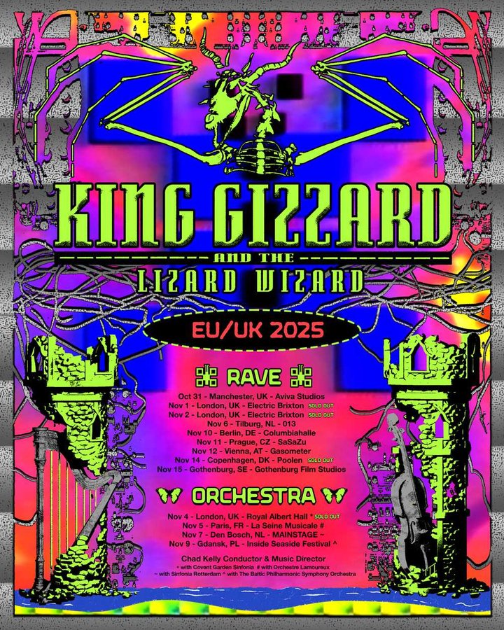 KGLW will now head to Europe for gigs at places like the Royal Albert Music Hall, SaSaZu, and Poolen. Some will be raves, some with orchestras, some will simply rock. All will rule. Get your tickets on the King Gizzard website.