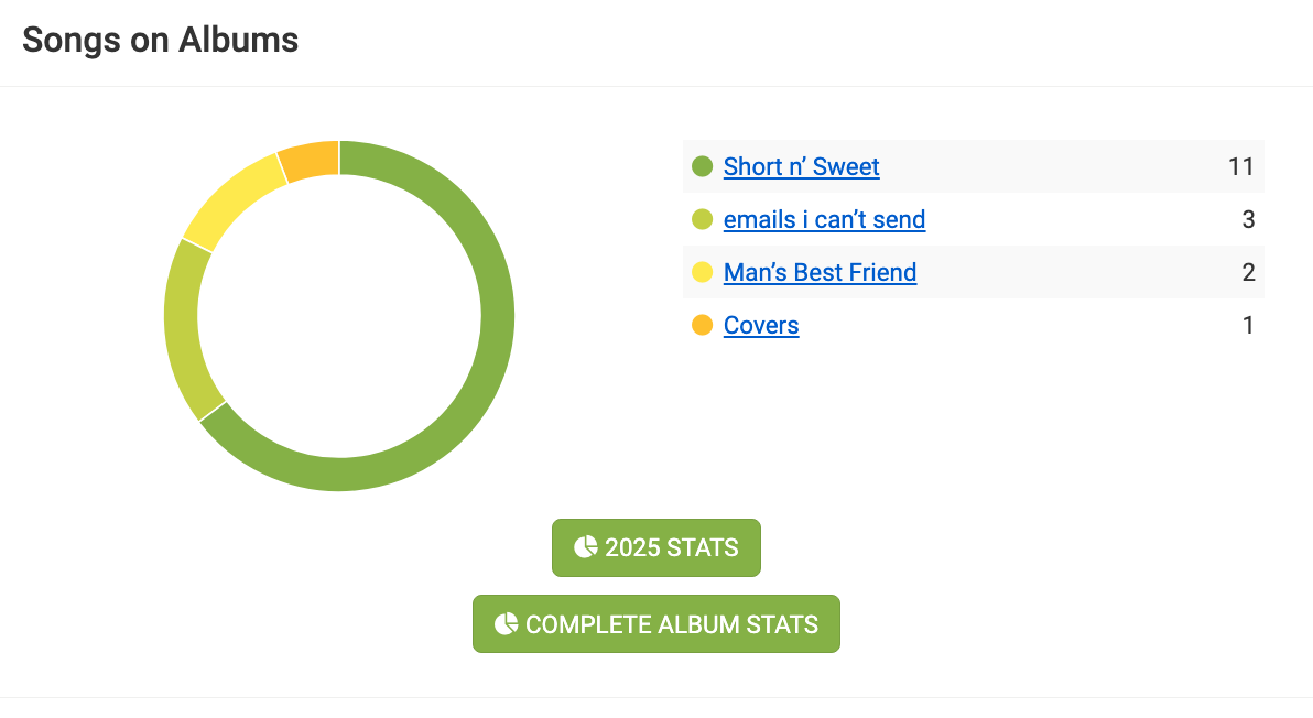A whopping baker's dozen were from Short N' Sweet. Hell she played more off emails I never sent than she did off 2025's top album debut by a female on Spotify.