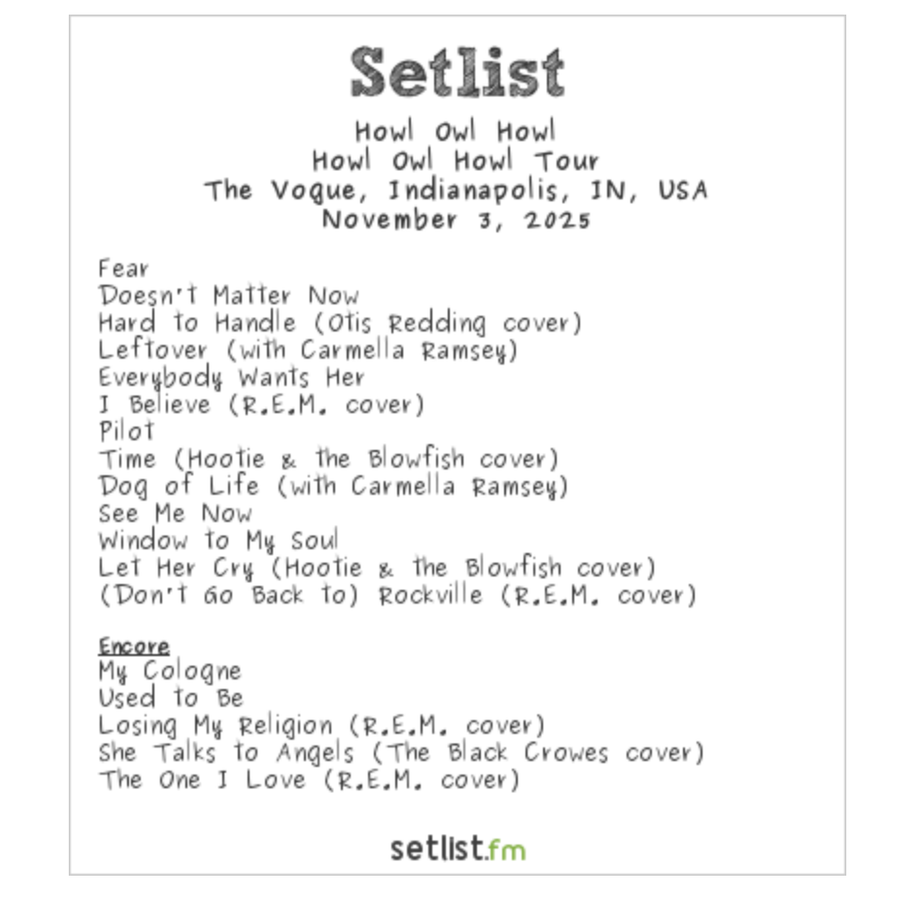 You get the delightfully named Howl Owl Howl, the supergroup of Darius Rucker (Hootie), Mike Mills (REM), and Steve Gorman (Crowes) who played their first show Monday (11/3) at The Vogue in Indianapolis.