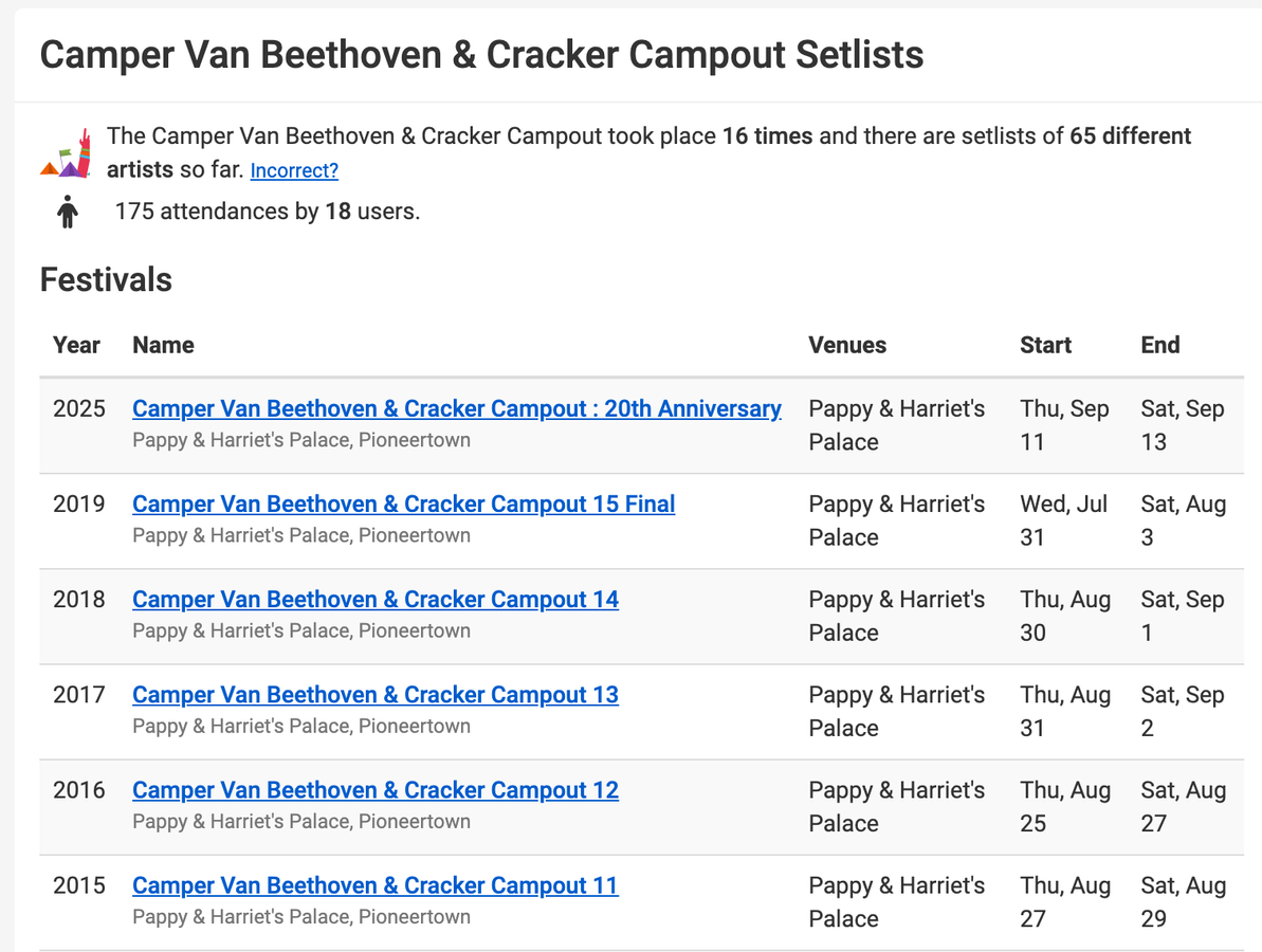 Fun fact #1: Cracker have played Pappy's the most so far with 28 appearances. The CVB & Cracker Campout has occurred 16 times over 20 years.