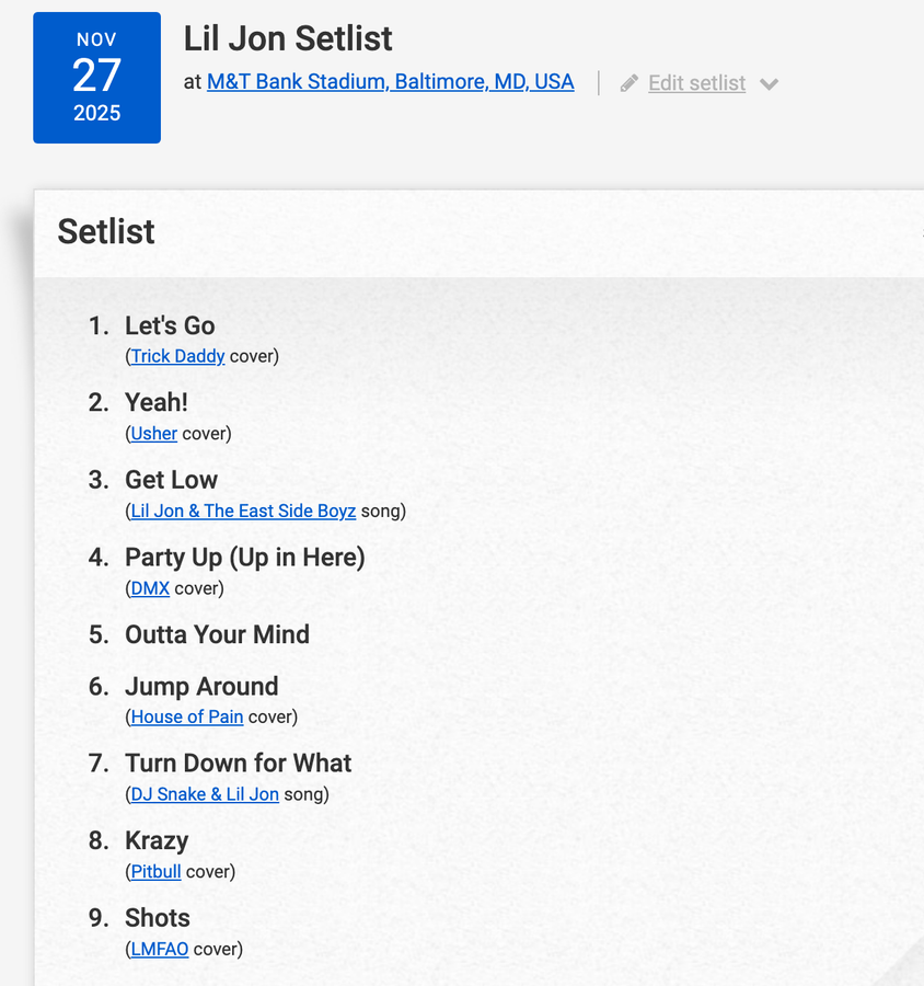 The opposite could be said for Lil Jon's 10-minute set in Baltimore for the late game.